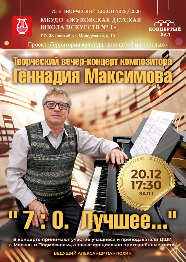Творческий вечер-концерт композитора и преподавателя ГЕННАДИЯ МАКСИМОВА «7:0. ЛУЧШЕЕ» состоится т в ЖДШИ № 1 состоится в Жуковской детской школе искусств № 1