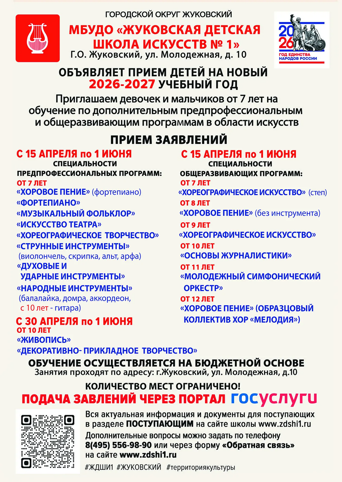 ЖУКОВСКАЯ ДЕТСКАЯ ШКОЛА ИСКУССТВ № 1 ОБЪЯВЛЯЕТ ПРИЕМ ДЕТЕЙ НА НОВЫЙ 2026-2027 УЧЕБНЫЙ ГОД