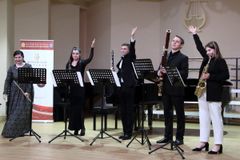 Для ценителей искусства выступили преподаватели секции духовых и ударных инструментов ЖДШИ № 1 Елизавета Жилёва (саксофон), Тереза Лолейт (флейта), Илья Лолейт (кларнет), Зиляра Каримова (гобой) и Александр Смирнов (фагот).
